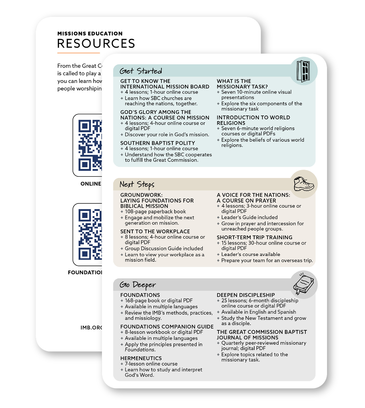 This Scope & Sequence Card provides details on and links to each of those resources. These cards can be used by individuals to learn more about IMB missions education resources or to hand out to church leaders looking to equip others.
