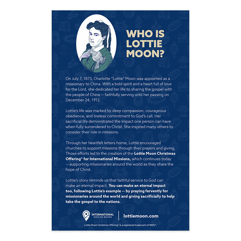 This 8.5" x 5.5" insert one-pager provides a concise biography of Lottie Moon. It shares information about her life as a missionary in China and her historic request for an annual offering by Southern Baptists.